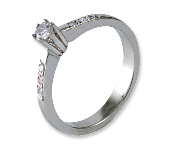 Solitario con diamantes talla brillante. Brillantes en brazo. Peso total 0.18Cts