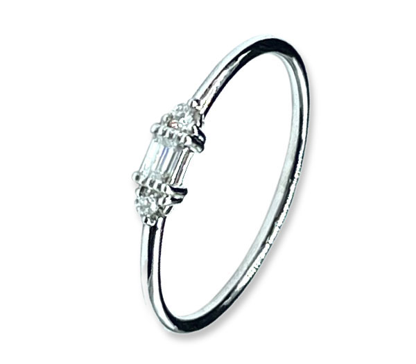 Anillo compromiso con baguette central de 3.75 x 2mm brillantes en lateral. Peso total 0.18Cts